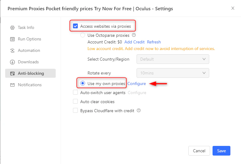 一些工具会使用搜索引擎作为代理测试目标:如果您的代理测试失败,这可能就是原因。请确保您的测试目标域名不是搜索引擎(此设置在工具配置中,而非 Bright Data 代理的控制范围内)。什么是 Octoparse?