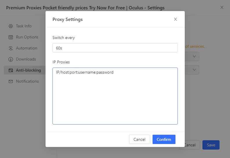 在弹出的窗口中,按以下格式输入您的 Bright Data 代理信息:如果您使用的是轮换代理,可以在 Switch interval(切换间隔)中设置 IP 轮换的频率。对于保持会话的代理,请根据需要调整会话时长。