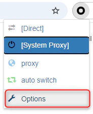 - 点击浏览器工具栏的 SwitchyOmega 图标 并选择 Options 打开设置页面。