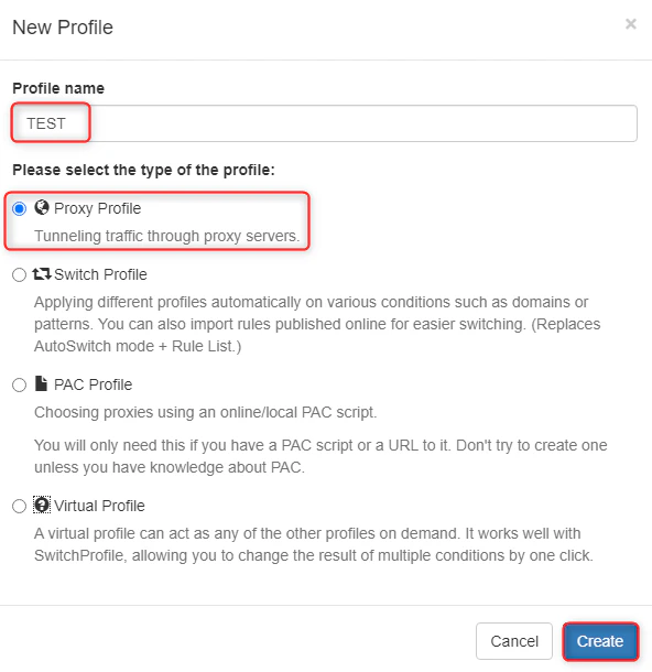 - 为配置文件提供一个描述性名称(例如 “Bright Data Proxy”),选择 Proxy Profile,然后点击 Create 保存。