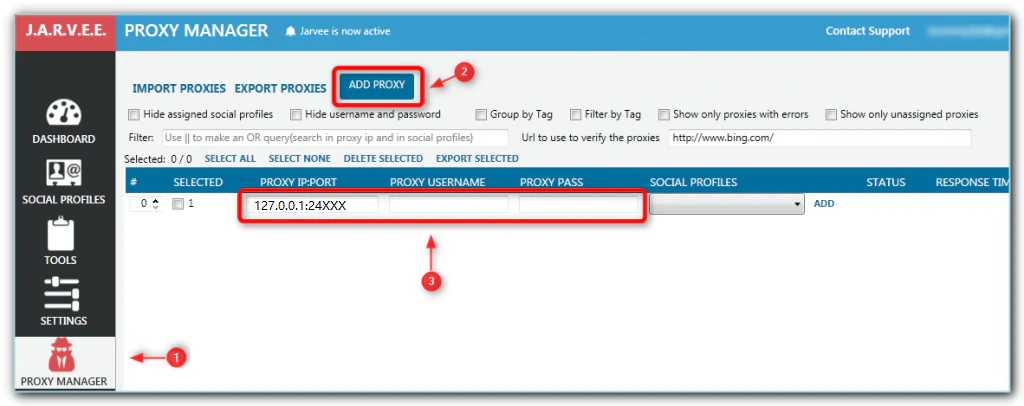 - 在Jarvee 左侧,选择“Proxy Manager”选项卡。