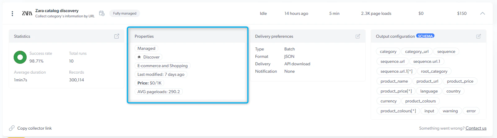 - 3 dots Here you can perform different functions with the data collection job: The statistics page presents essential information about the success of the data collection. Below is a list of all the terms included in the statistics table: