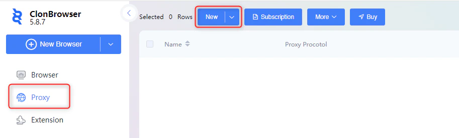 Step 1. Download and Install ClonBrowser 1. Visit the ClonBrowser website and download the application for your operating system. 2. Install the application and log in with your account credentials. Step 2. Set Up a New Browser Profile 1. Navigate to the Proxy tab within the profile management section. 2. Click New to start creating a new browser profile.