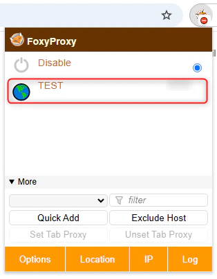 - To enable your configured proxy, click the FoxyProxy icon in your toolbar and select the proxy you just created.