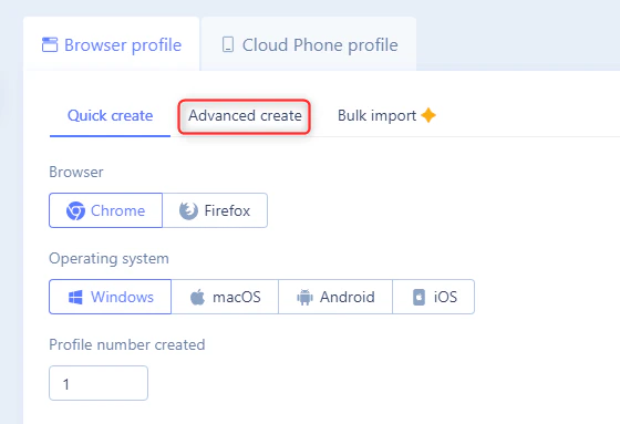 Enter the profile name, select your desired browser fingerprint, and click Advanced Create to access additional settings.
