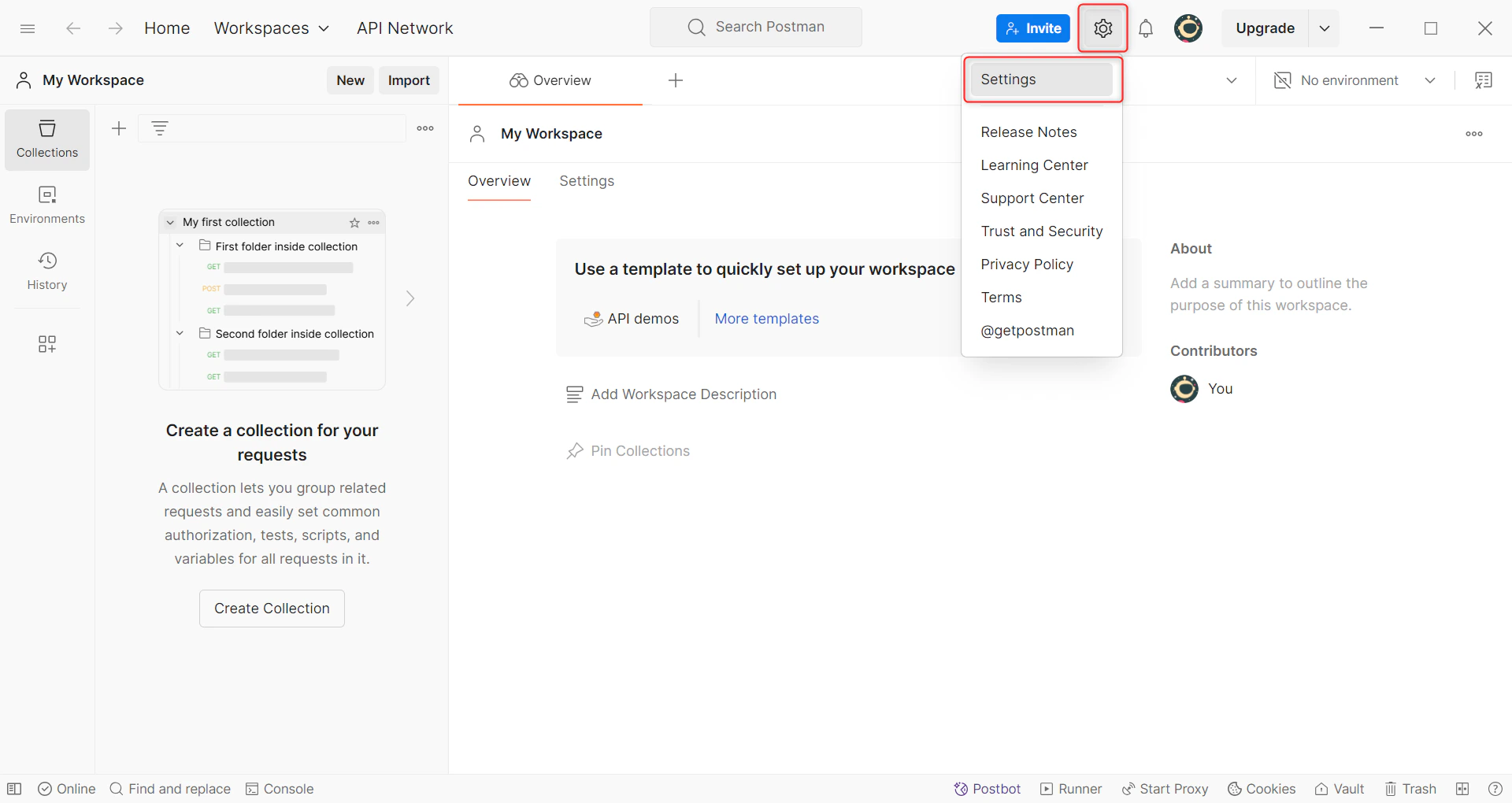 - In the Postman interface, click the gear icon in the top-right corner to access the Settings menu.