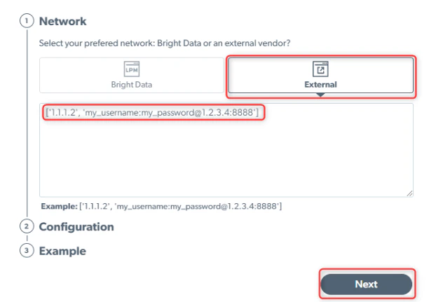 Bright Data Proxy Manager supports external proxies from other vendors. Connecting external proxies will allow you to optimize and manage all of your proxies in one place.