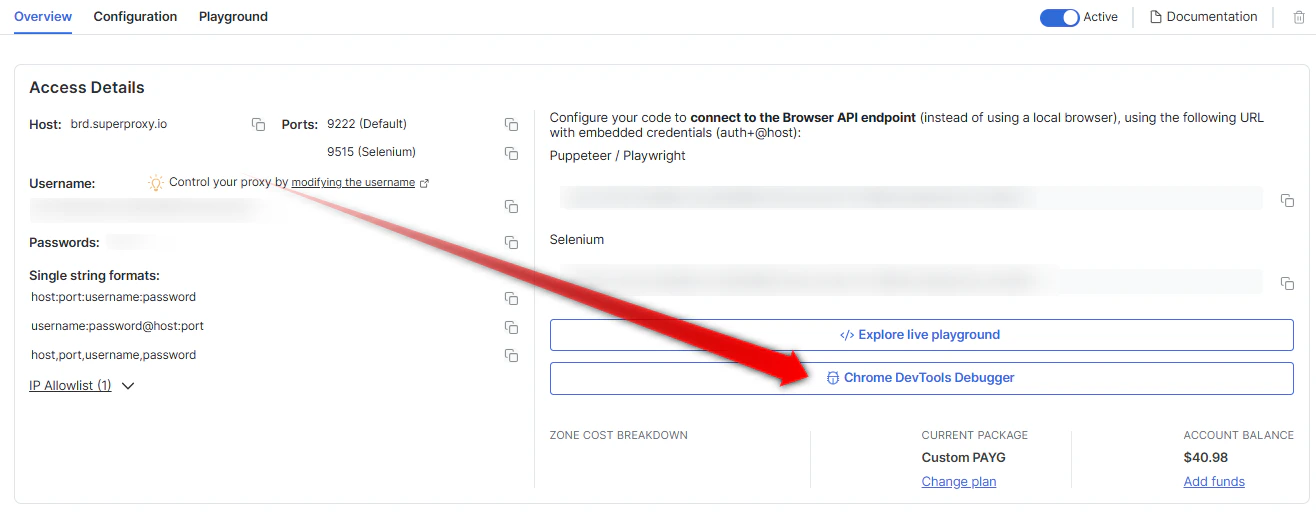 The Browser API Debugger can be easily accessed within your Bright Data Control Panel. Follow these steps: